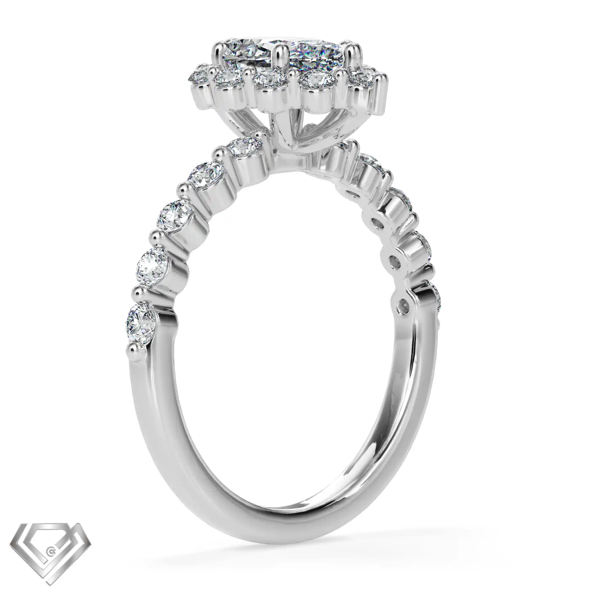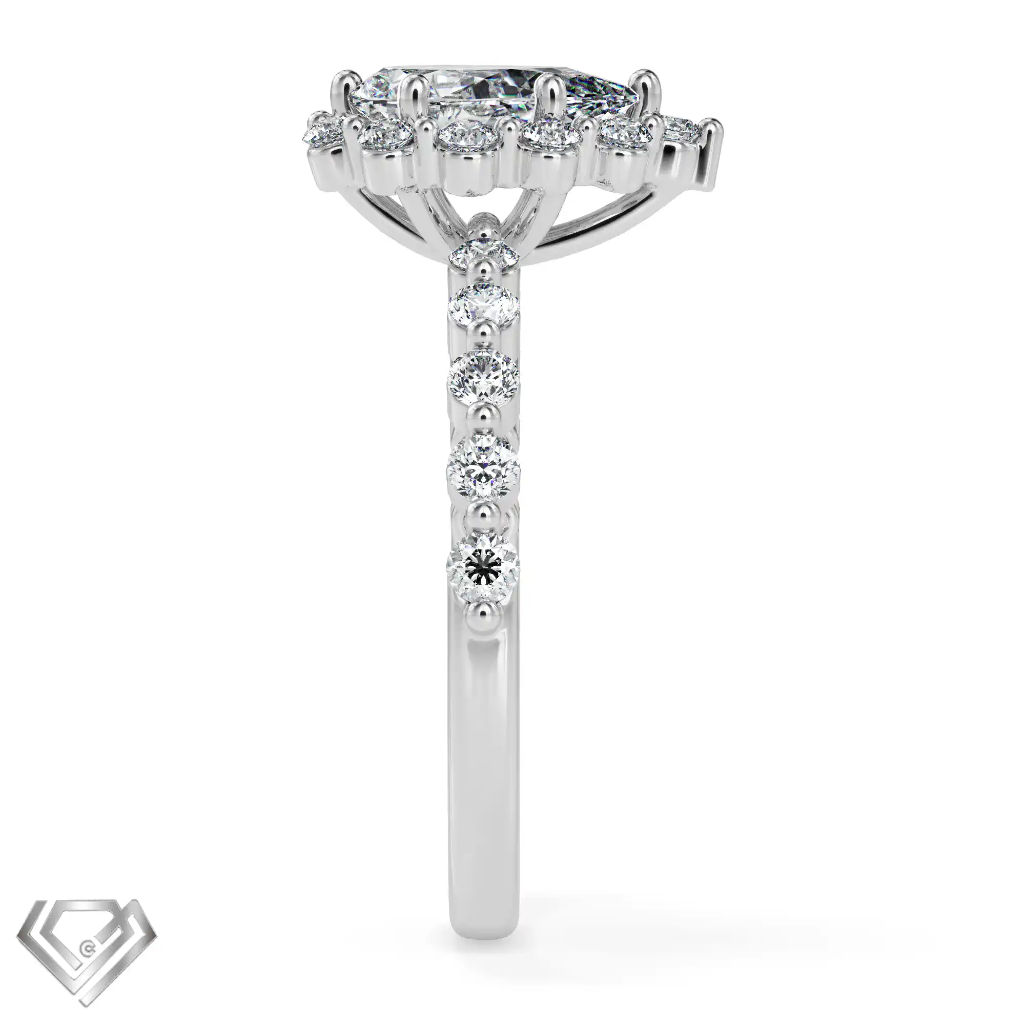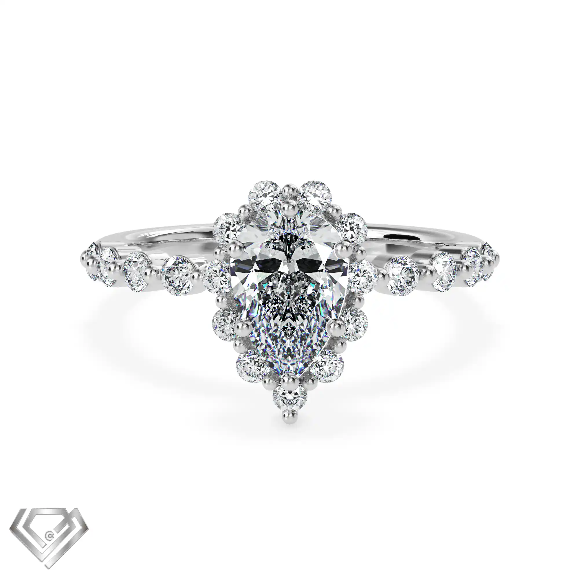 Silver ring set with 1 pear cut stone and 10 rbc 0.01ct stones